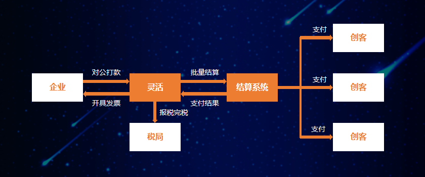 在地方税务部门的授权下,为共享经济业态企业和自由职业者两端提供结算支付服务,并为自由职业者提供个人经营所得税代缴服务,解决自由职业者平台经营收入的批量小额资金下发效率低、发放合规性问题,以及自由职业者个人所得纳税合规性问题。